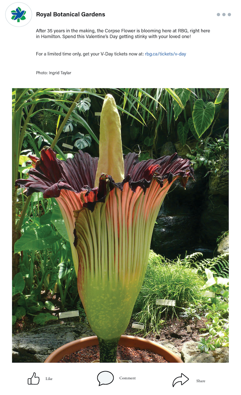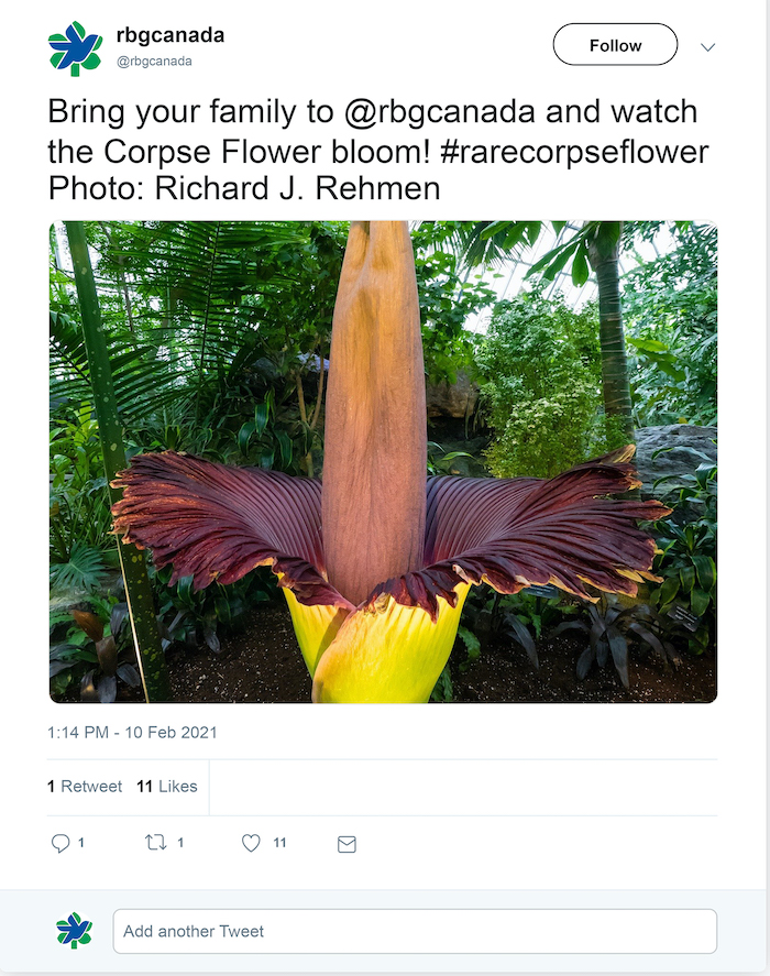 When I woke up one morning to read in the local news that “a rare corpse flower is about to bloom” in a greenhouse near me, I thought I’d accidentally tapped into my Humber Blackboard. But no, this was a massively rare—and pretty hilarious—co-incidence. I had to see it for myself and get photographic evidence for our students.