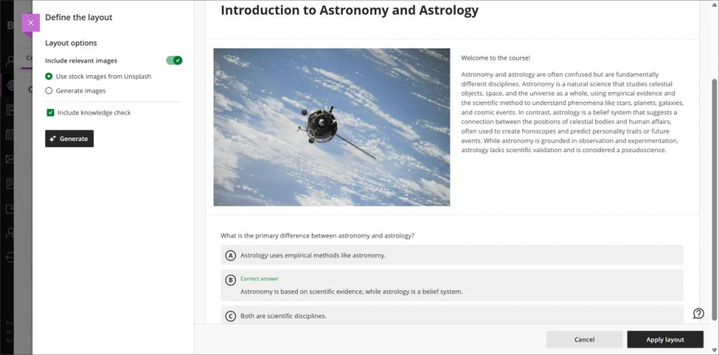 - Learn more about using the AI Design Assistant in your Documents by following the instructions and guidance at our “Generate Document Layouts: Blackboard’s AI Design Assistant” article.