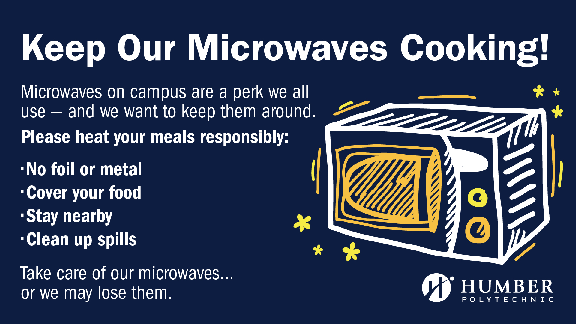 Since September, Humber’s Campus Services team has had to replace many of the microwaves across our campuses due to improper use — including placing foil inside, leaving food uncovered, and overheating items.
