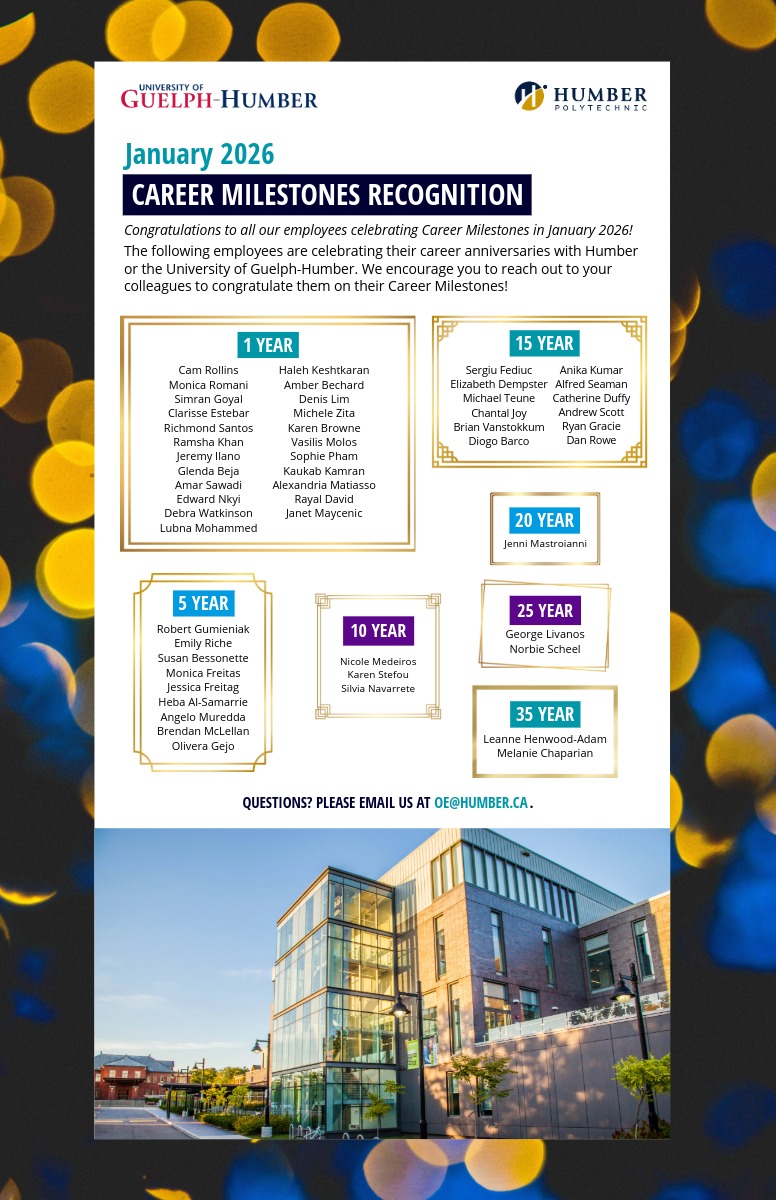 The following employees are celebrating their 1, 5, 10, 15, 20, 25 and 35-year anniversary with Humber. We encourage you to reach out to your colleagues to congratulate them on their Career Milestones.