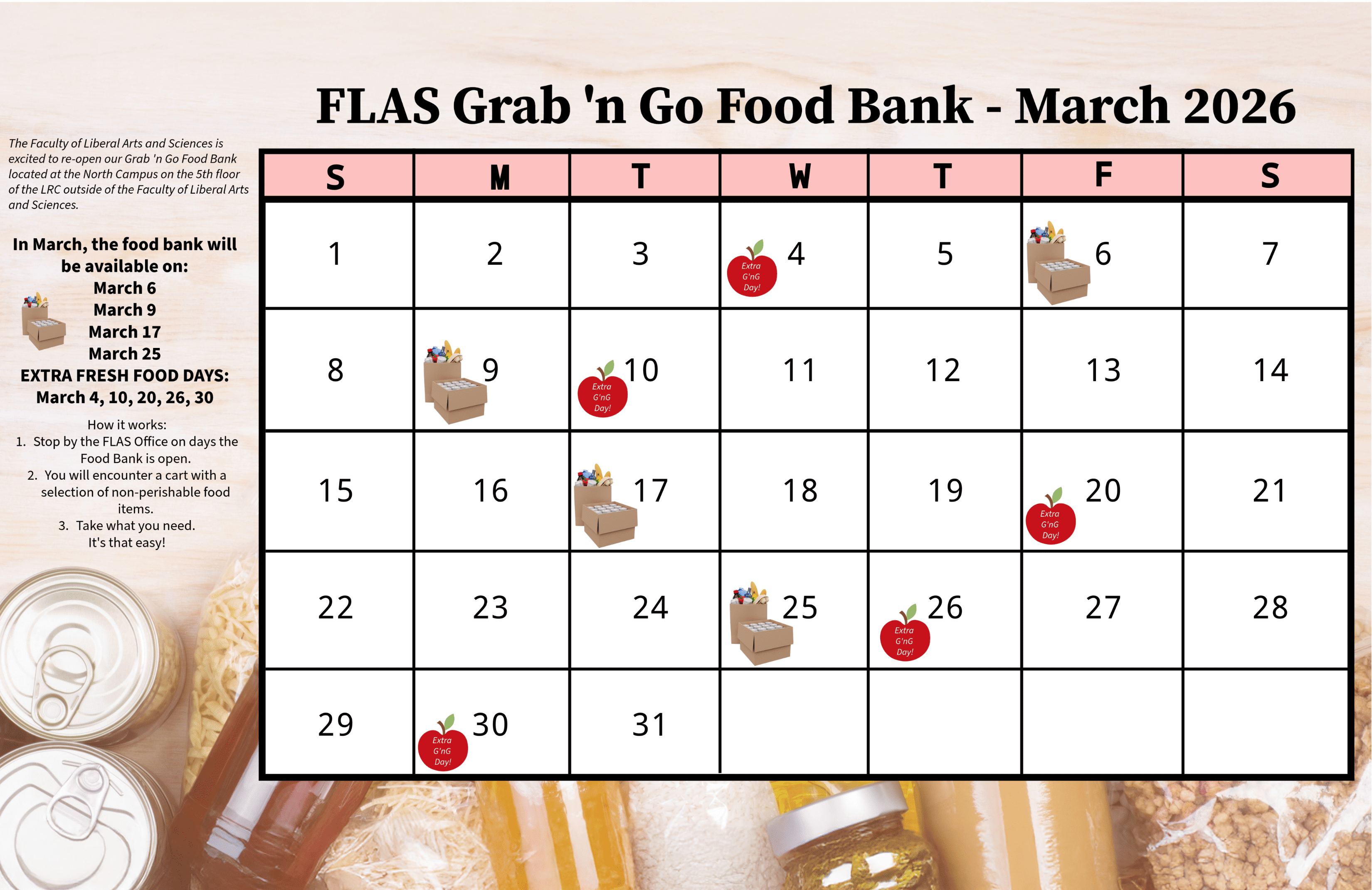 In March, the FLAS North Campus Grab 'n Go Food Bank will be open on the following dates from 9 a.m. to 4:30 p.m.: