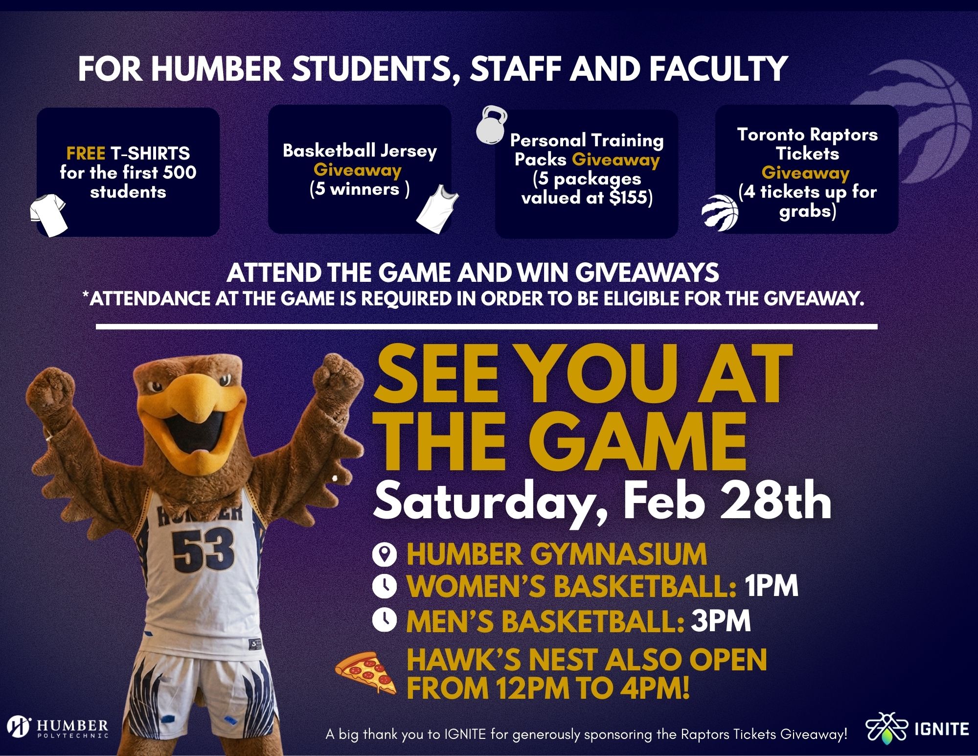 The Humber Hawks Women and Men's teams are competing in the OCAA Playoffs this weekend on Saturday, February 28 at 1 p.m. and 3 p.m., respectively. Entrance is free for Humber students, staff, and faculty! Lots of amazing giveaways for Hawks Fans who attend the game including Raptors tickets, free t-shirts, and personal training packs.