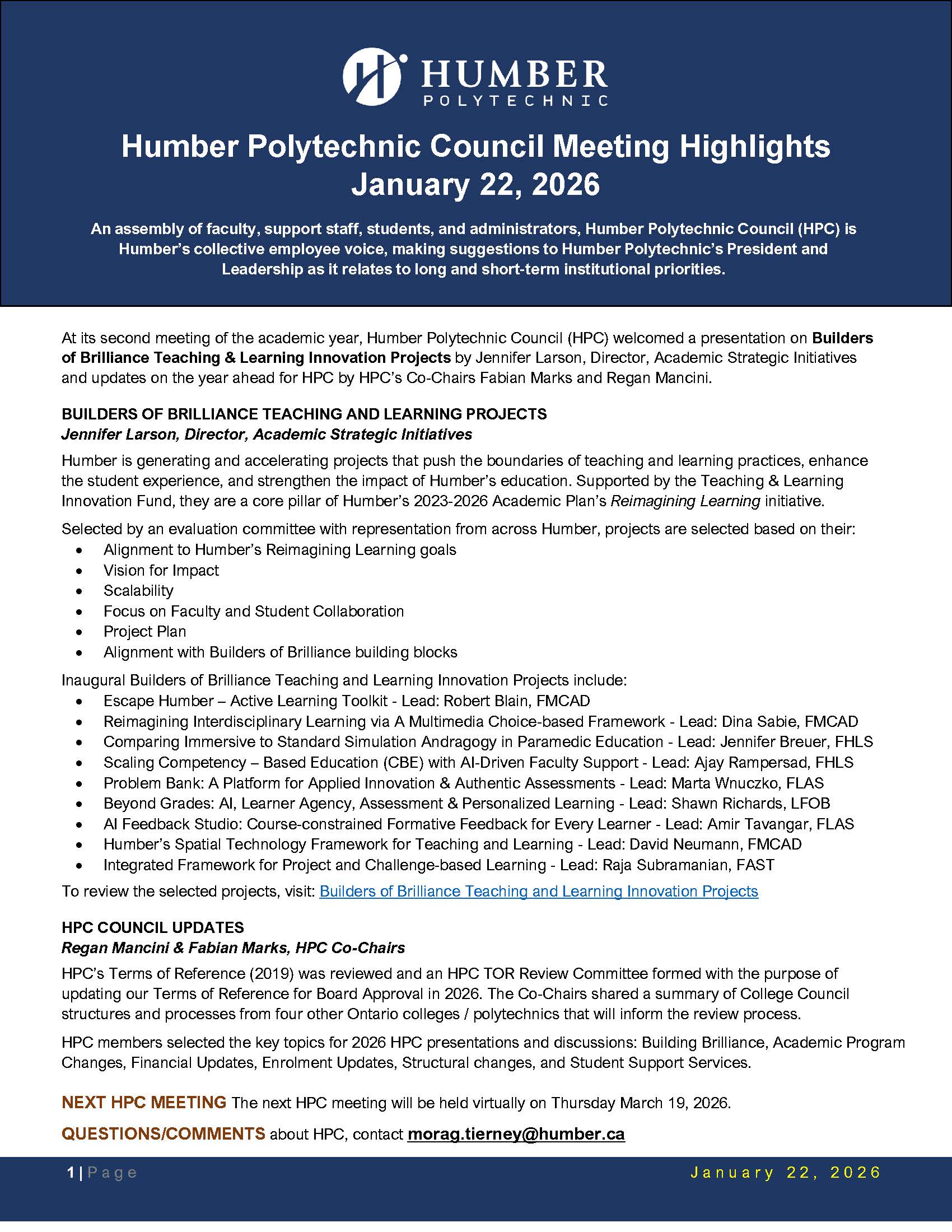 At its second meeting of the academic year, Humber Polytechnic Council (HPC) welcomed a presentation on Builders of Brilliance Teaching & Learning Innovation Projects by Jennifer Larson, Director, Academic Strategic Initiatives and updates on the year ahead for HPC by HPC’s Co-Chairs Fabian Marks and Regan Mancini.