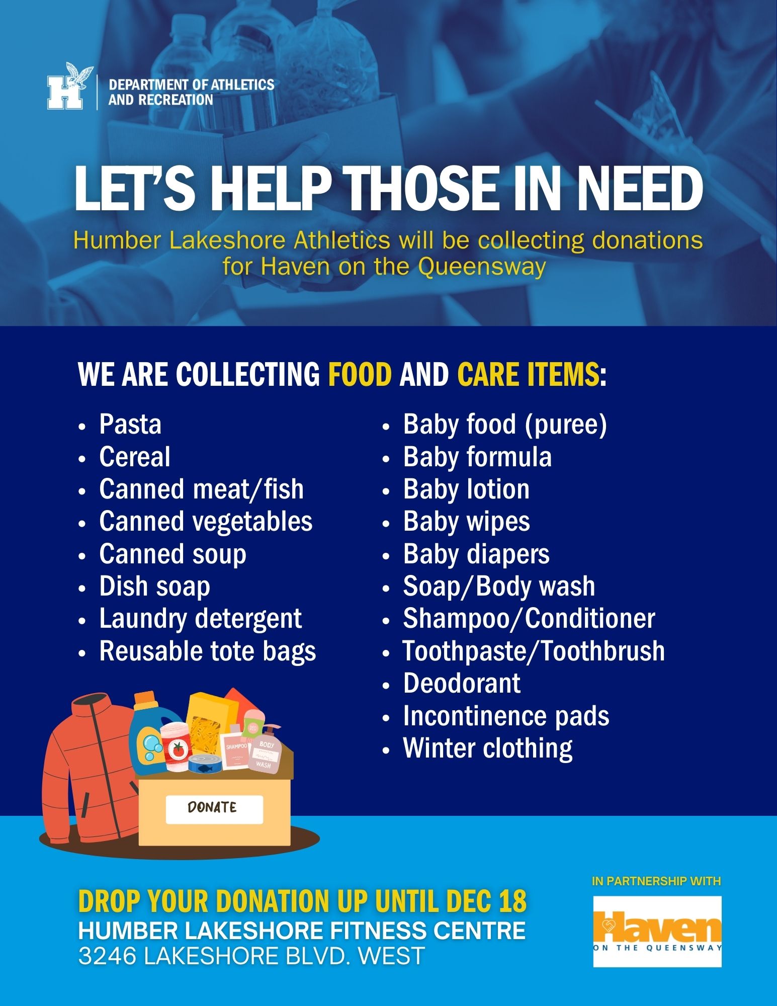 This year, Humber Lakeshore Athletics is partnering with Haven on the Queensway to help local families in need. We’re inviting our community to contribute non-perishable food and care essentials at the Humber Lakeshore Fitness Centre (3246 Lakeshore Blvd) until December 18.