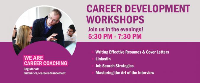 Want to support your students with job search preparation? Find out more about our Career Development Workshops below or visit humber.ca/careeradvancement for more information on our evening career coaching service. Poster attached.