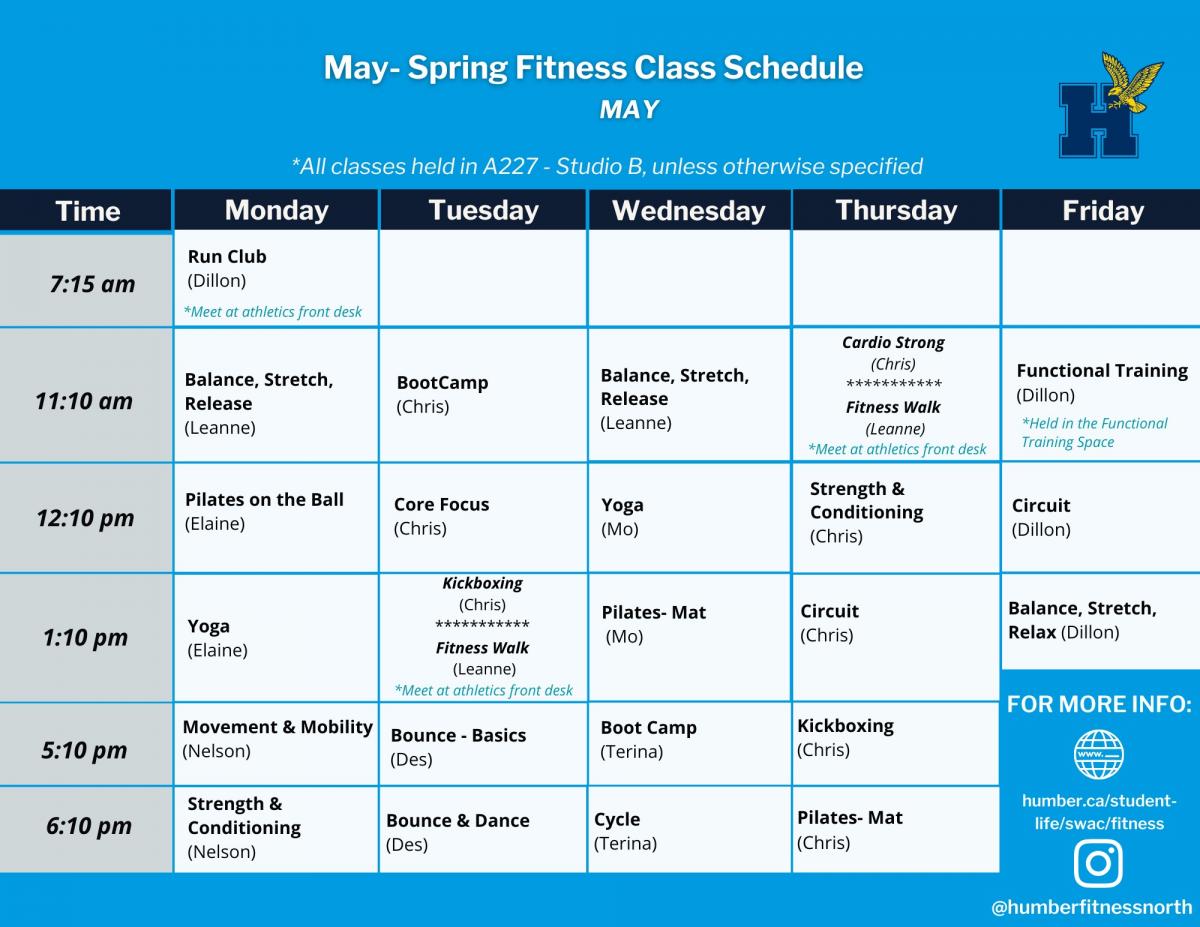 Please note that the Fitness Centre will be closed on all statutory holidays that Humber is closed and therefore no classes will run on those days.